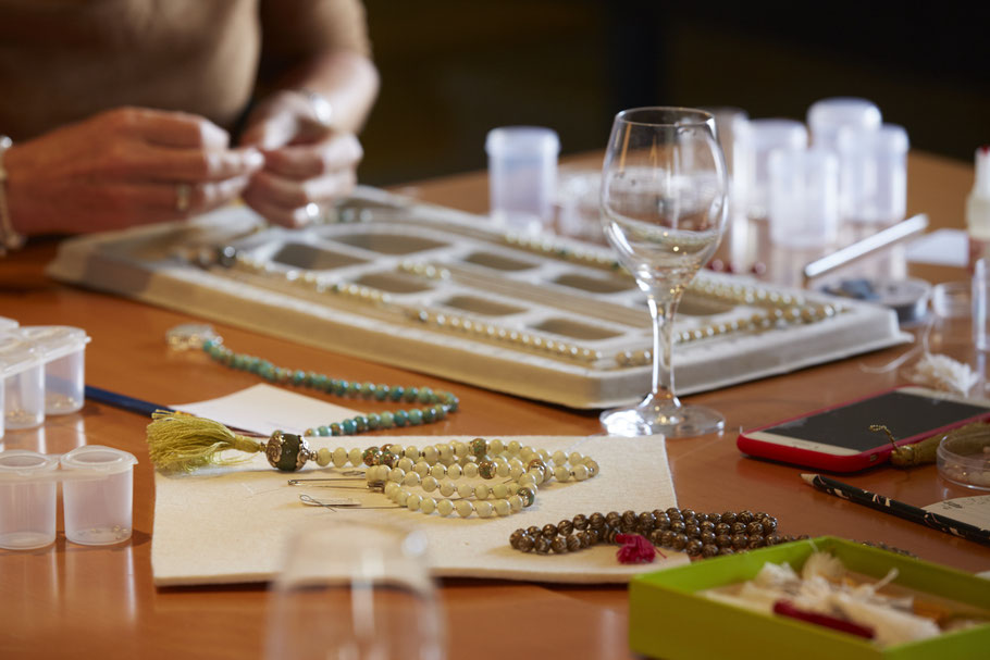 Zuchtperlen, eine große Auswahl an Halbedelsteinen, Glasschliffperlen sowie Anhänger und Zwischenteile aus Sterlingsilber. Es besteht außerdem die Möglichkeit einer individuellen Veranstaltung